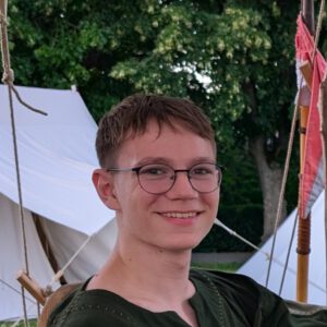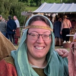 “Mich fasziniert, dass in der sogenannten „dunklen Zeit“ so schöne Kleidung und Schmuck hergestellt werden konnten. Deshalb finde ich besonders das Nähen von Gewandung spannend und setze das in der Praxis um.”